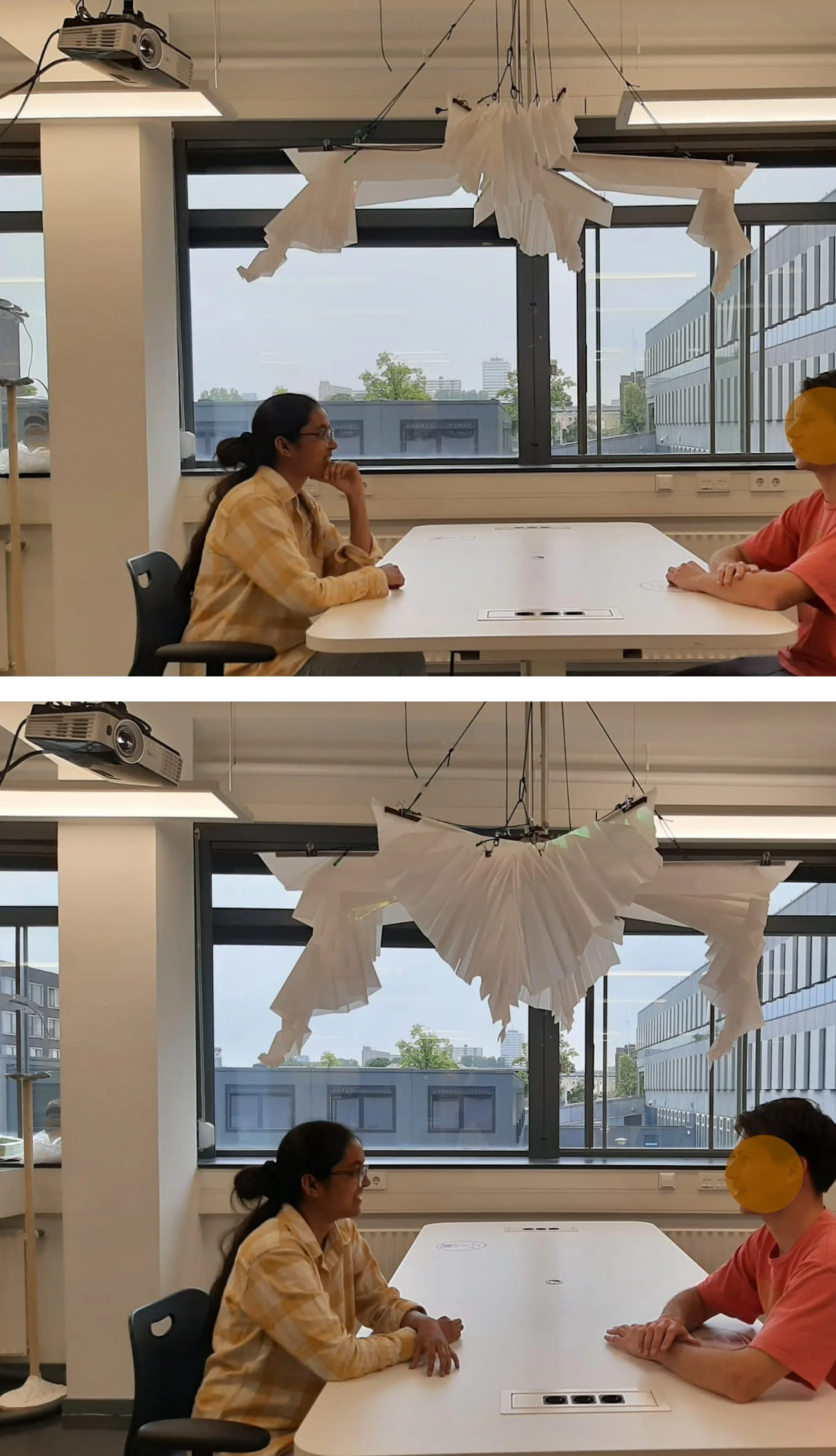 If there is listening and responding or there are meaningful silences, the object grows constantly. However, the growth of the object freezes when there is crosstalk with constant interruptions. Based on the AI, motors control the growth of each segment individually.