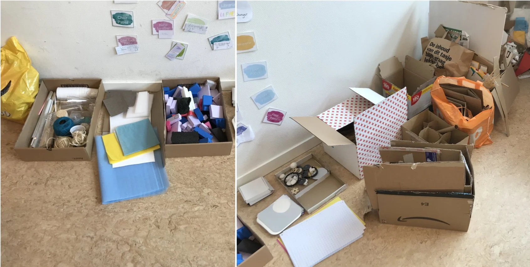 Materials were selected to generate quick low-fidelity and flexible prototypes for ideation. Basic and generic materials instead of fancy materials such as glitters or stickers or specific materials such as scaled furniture or puppets were provided for prototyping. These were chosen for their low-level meaning and capacity to build, think and express with. A variety of material and tactile characteristics were provided to offer inspiration for ideation. These ranged from base materials such as paper, cardboard, foam sheets, fabric pieces, shoe boxes to foam pieces of different shapes, plastic cups, odd objects and knick-knacks; material often used for design prototyping.Tinkering material such as needle and thread, beads, buttons and sticks along with crafting material to join, combine, paste or modify prototypes was available for prototyping.